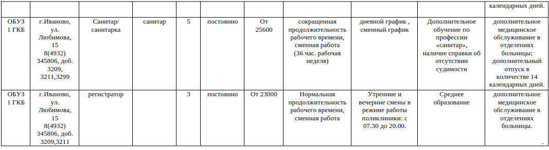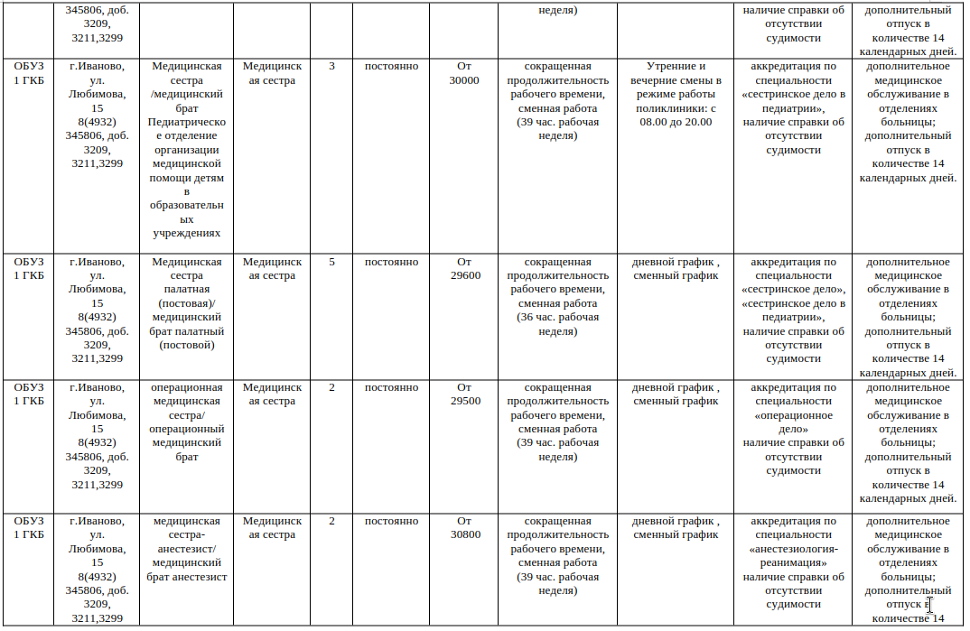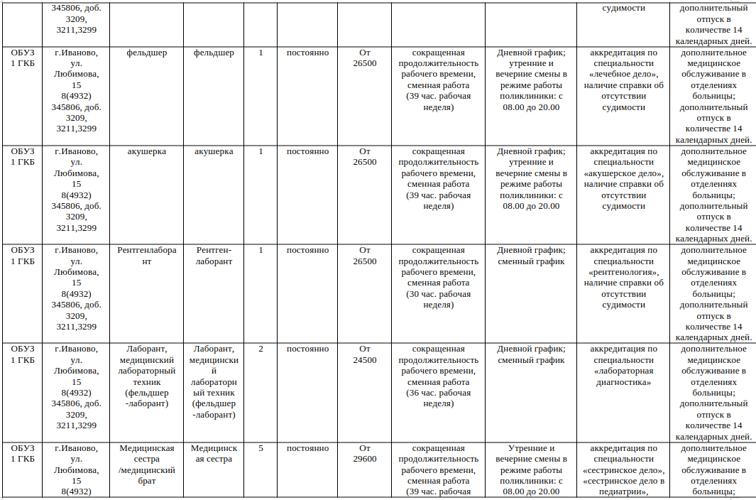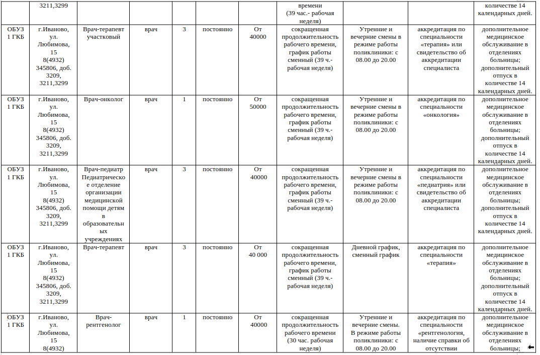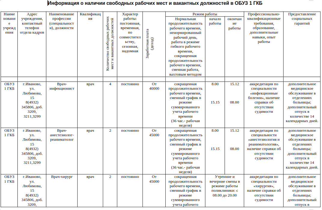 | | Областное бюджетное учреждение здравоохранения приглашает на работу:— врача-инфекциониста — врача-терапевта участкового — врача анестезиолога-реаниматолога — врача-педиатра — врача-рентгенолога — медицинских сестер — рентгенолаборанта — лаборанта Мы предлагаем:— полный социальный пакет — стабильная заработная плата — дополнительный оплачиваемый отпуск в размере 14 календарных дней — льготное пенсионное обеспечение — опыт работы на новом современном оборудовании — общение с высококвалифицированными специалистами — гарантированное трудоустройство по ТК РФ — профессиональная переподготовка, повышение квалификации за счет средств учреждения — выплаты в соответствии с Постановлением Правительства Ивановской области: от 22.08.2019 № 300-п (единовременная выплата врачам — 300 тыс. руб.) от 23.10.2019 № 417-п (единовременная социальная выплата врачам на оплату первоначального взноса по ипотечным жилищным кредитам — 900 тыс. руб.) — бесплатная юридическая помощь работникам больницы (по личным и семейным вопросам) — бесплатное посещение театров, кино, спектаклей, льготные путевки в санатории, экскурсии, подарки детям на праздники и другие мероприятия для работников ОБУЗ 1 ГКБ Резюме просим Вас направлять на e-mail ok.@igkb1.ru Контактные телефоны: 8 (4932) 34-58-06 доб. 3209 — Латина Ольга Владимировна, начальник отдела 8 (4932) 34-58-06 доб. 3211 — Низова Инна Геннадьевна, специалист по кадрам График работы отдела кадров: 08:00-16:30 Адрес: г. Иваново, ул. Любимова, д. 15, корпус А1 (1-ый этаж) |